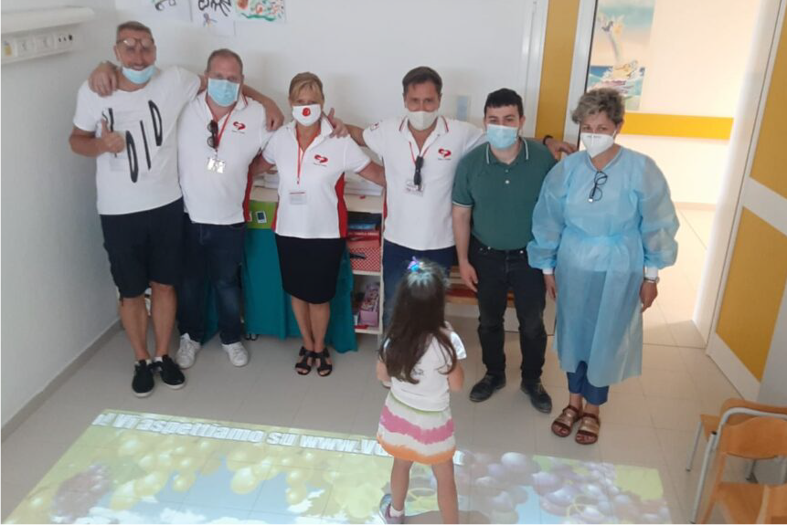 La collaborazione con l’associazione umanitaria, che coopera con l’ospedale pediatrico di Ferrara, abbiamo dato vita ad una serie sistemi di proiezione interattiva e dispositivi touch screen all’interno di aree di cura, per aiutare grandi e piccoli nella riabilitazione funzionale e motoria.